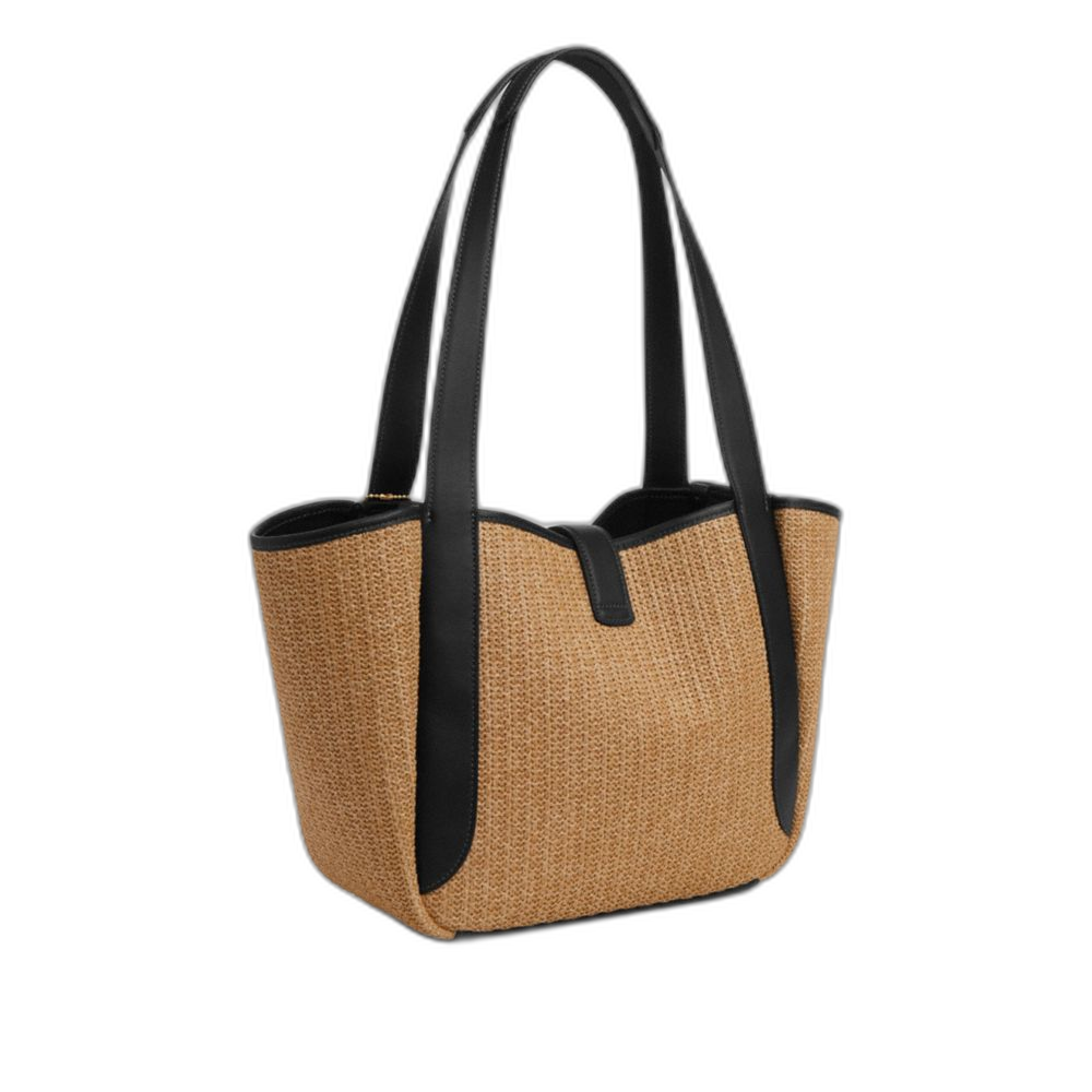 Straw and smooth leather Inside zip pocket Turnlock closure Handles with 11 1/2" drop 10 3/4" (L) x 9 1/2"... Read more