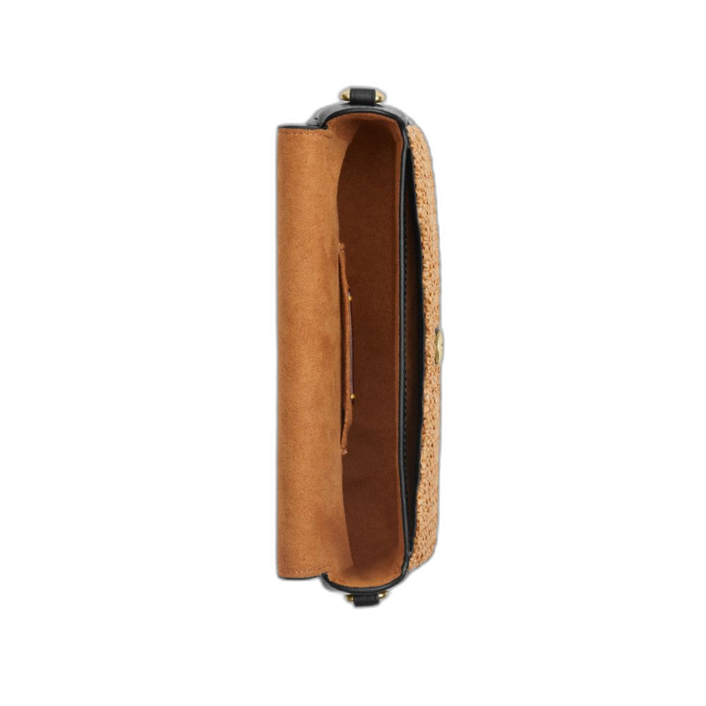 Straw and refined pebble leather Inside open pocket Snap closure, fabric lining Detachable handle with 8 1/4" drop Outside open... Read more
