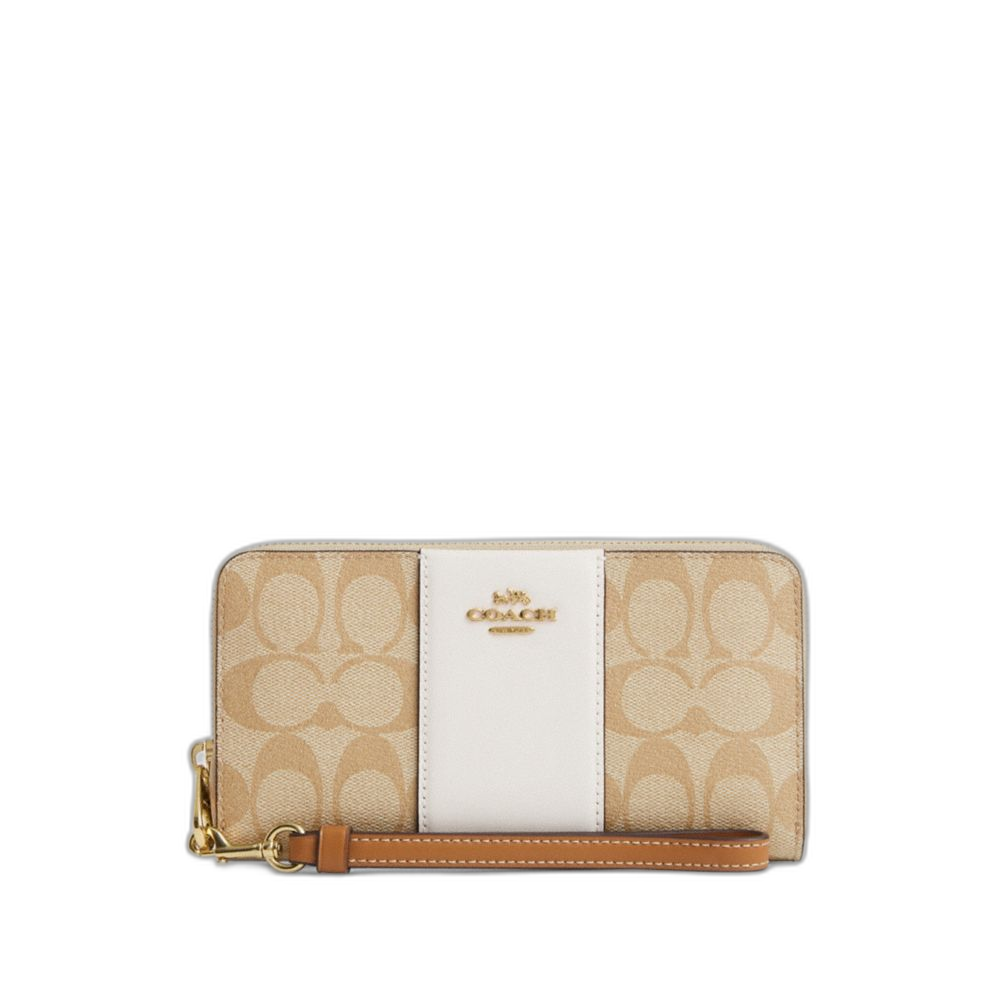 Coach Women's Long Zip Around Wallet In Signature Canvas With Stripe Gold/Light Khaki/Chalk Lt Saddle