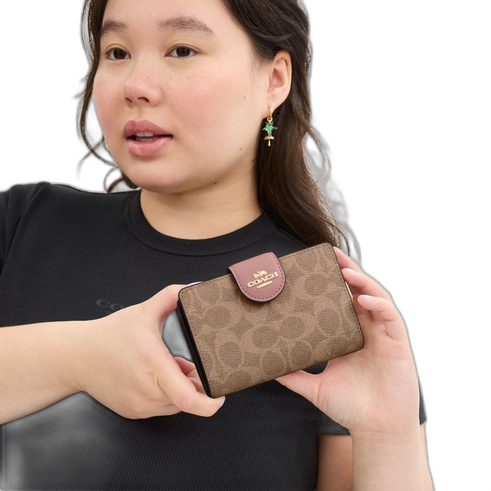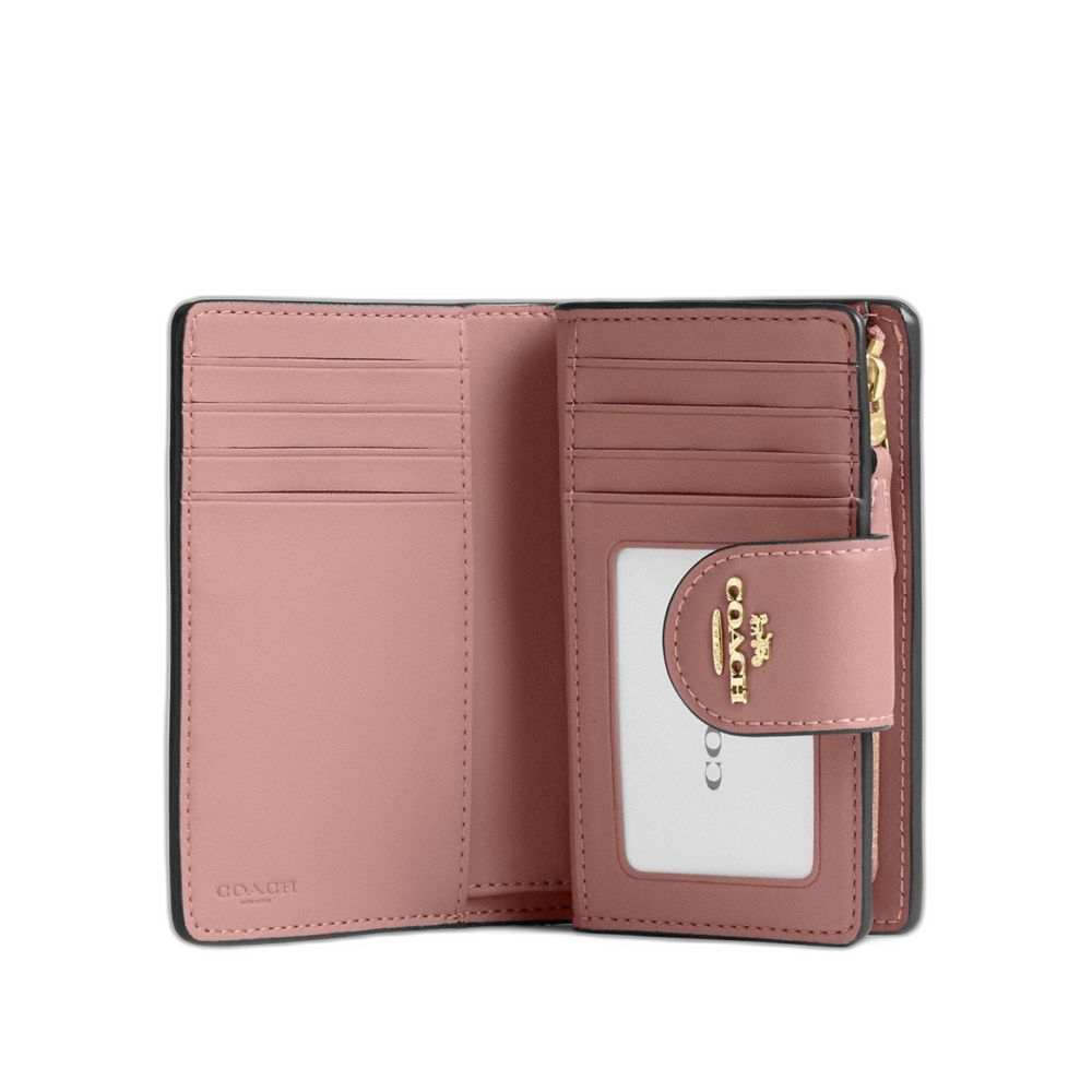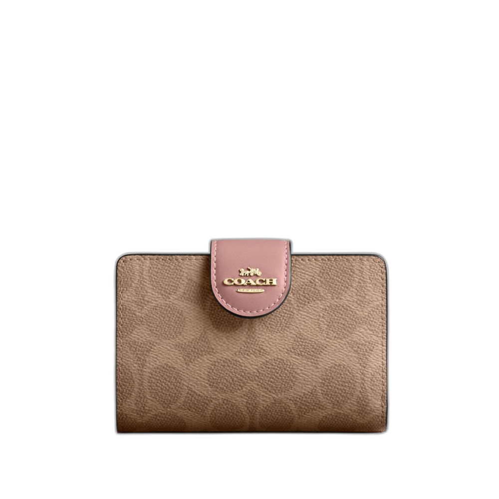 Coach Women's Medium Corner Zip Wallet In Signature Canvas Gold/Tan/Pink Petal