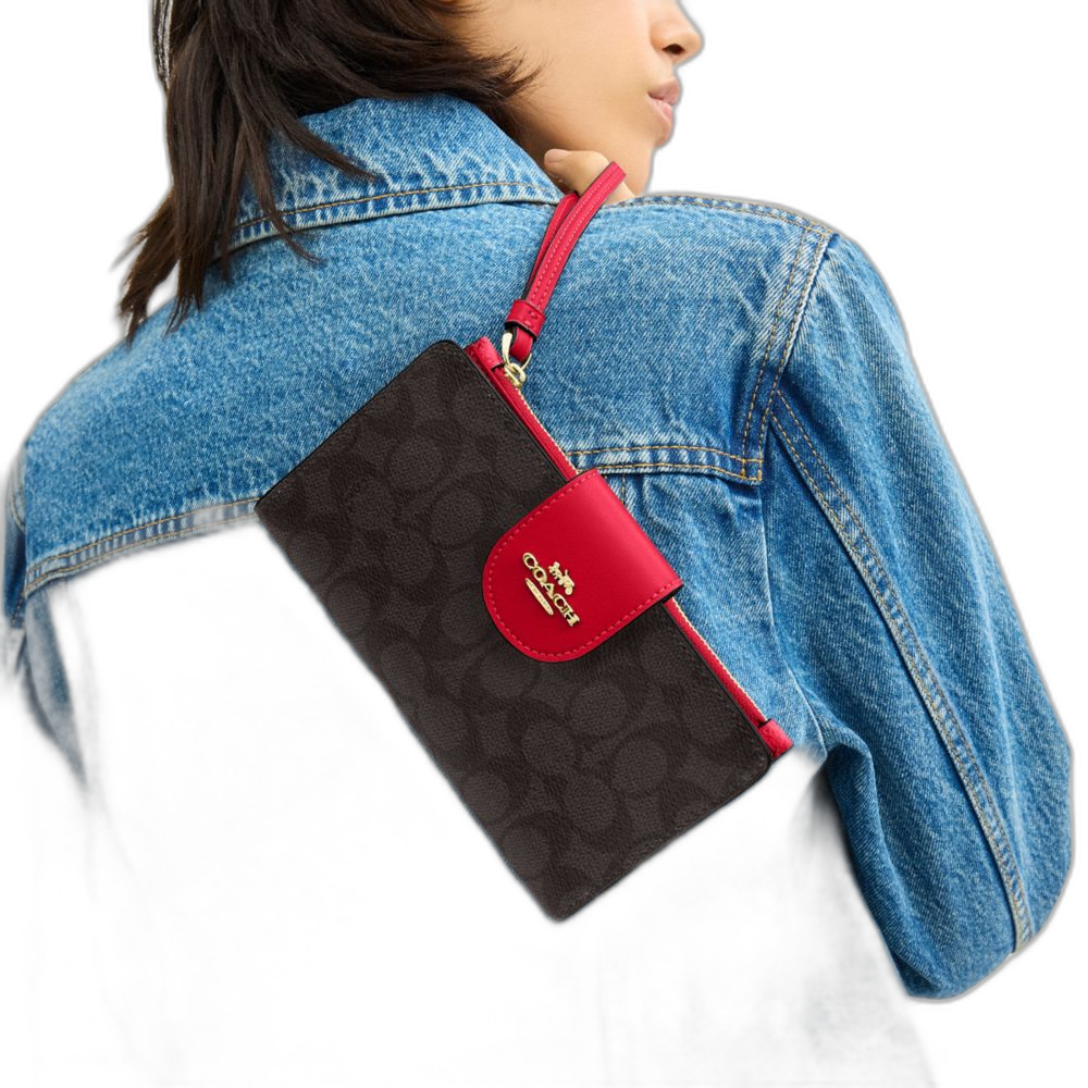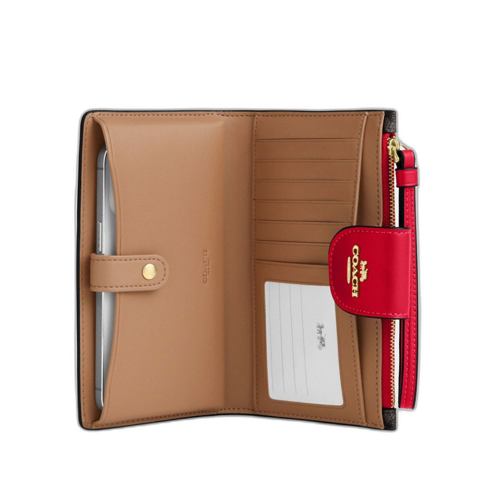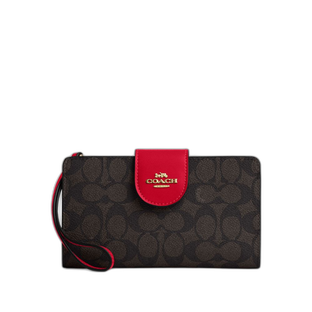Coach Women's Phone Wallet In Signature Canvas Gold/Walnut/Bold Red