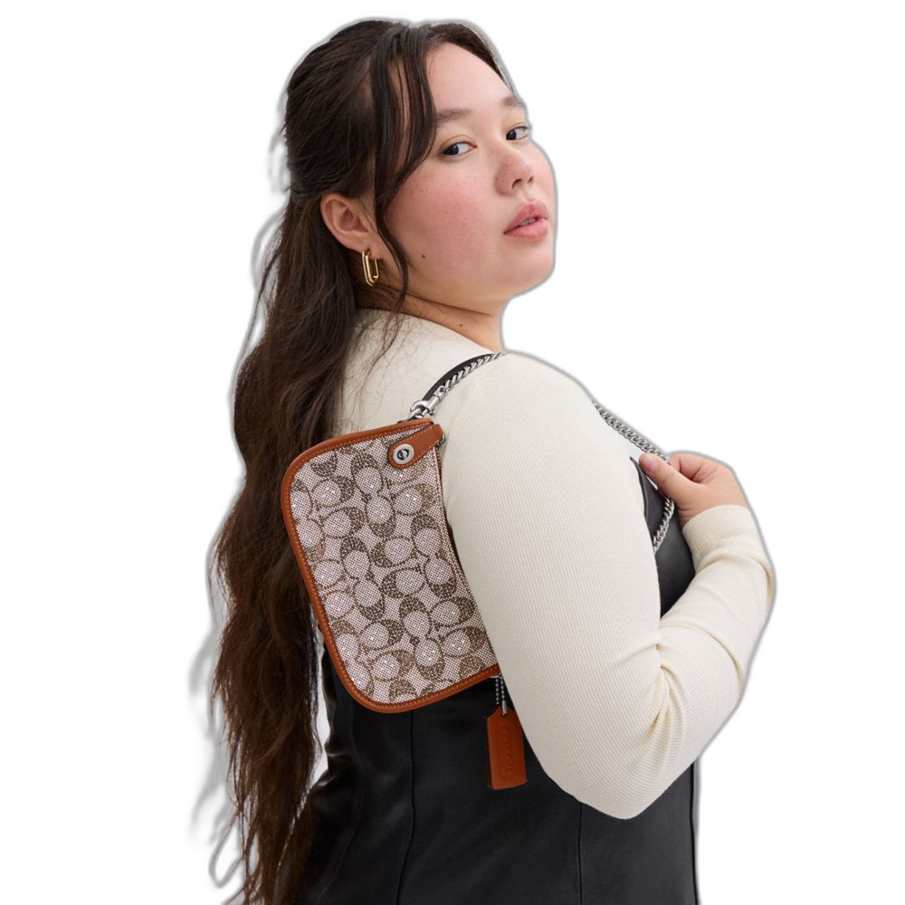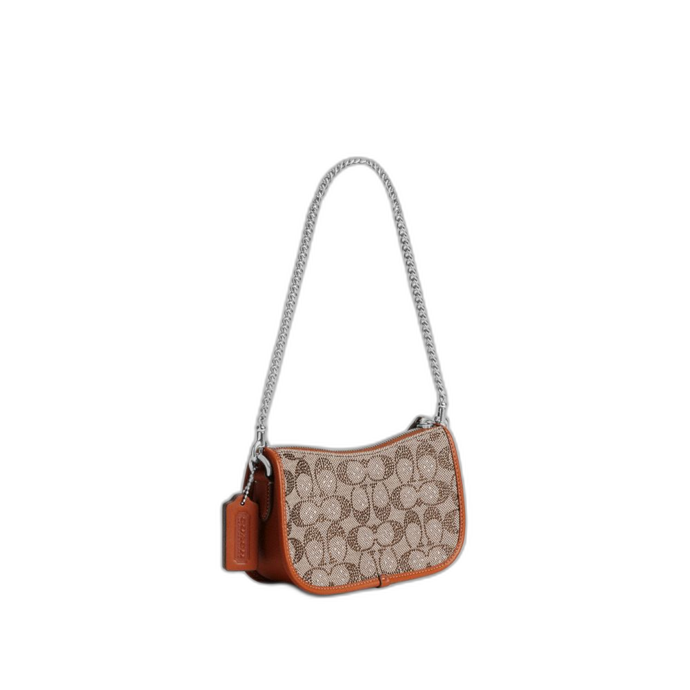 The Swinger 20 Bag is part of The Coach Originals, a collection of archival-inspired bags that celebrates our legacy and authentic New York heritage. This streamlined glovetanned leather and shimmery crystal-embellished Signature jacquard style is based on a 1980s Coach design reimagined for today. Featuring our iconic turnlock closure, the petite bag sits just beneath the underarm with the short chain strap or it can be carried as a clutch. Some styles are just too good to leave in the archives.