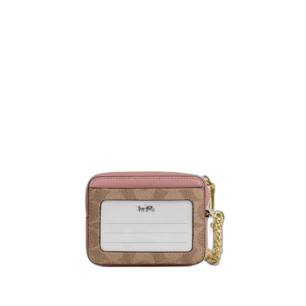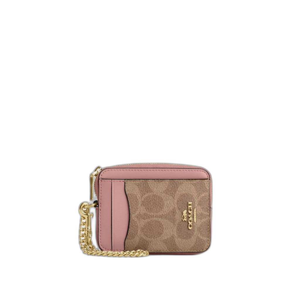 Coach Women's Zip Card Case In Signature Canvas Gold/Tan/Pink Petal