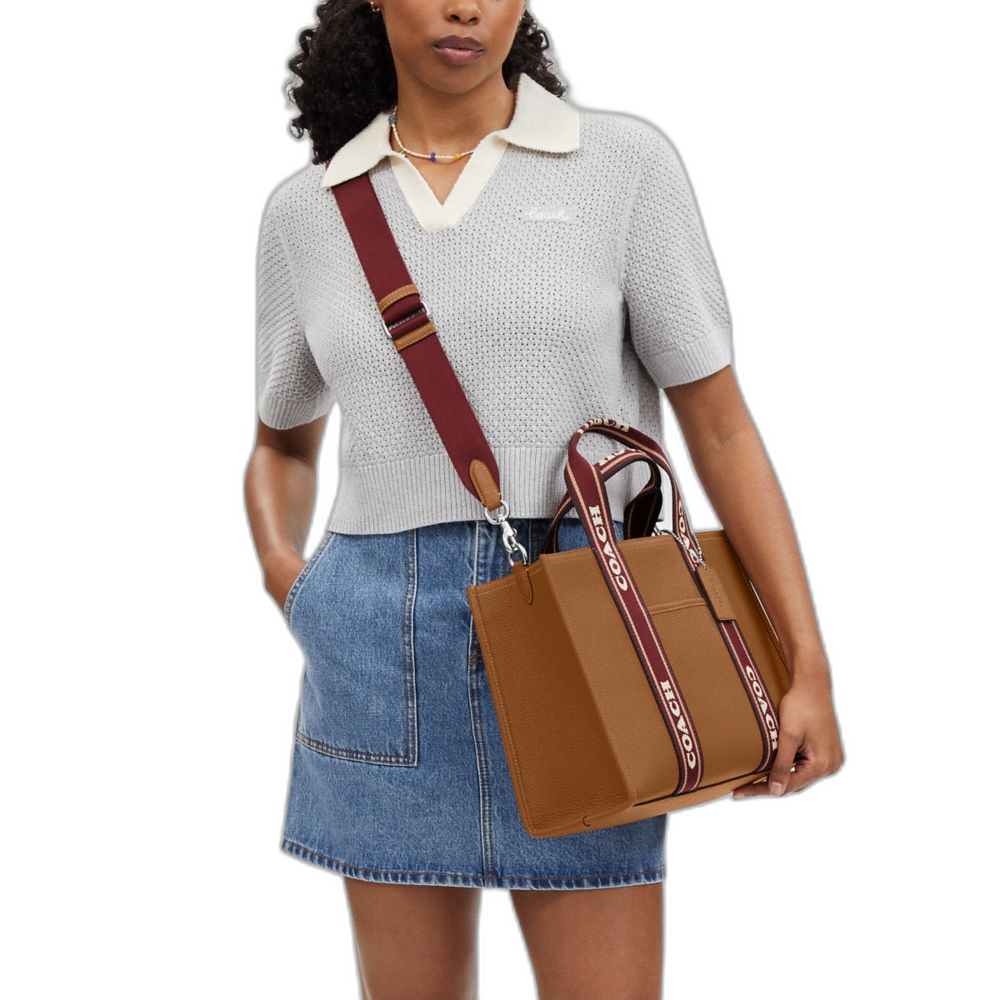 Refined pebble leather and webbing Inside zip and multifunction pockets Handles with 5" drop Outside open pocket Detachable strap with... Read more
