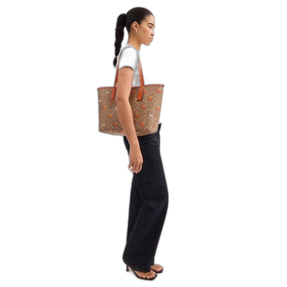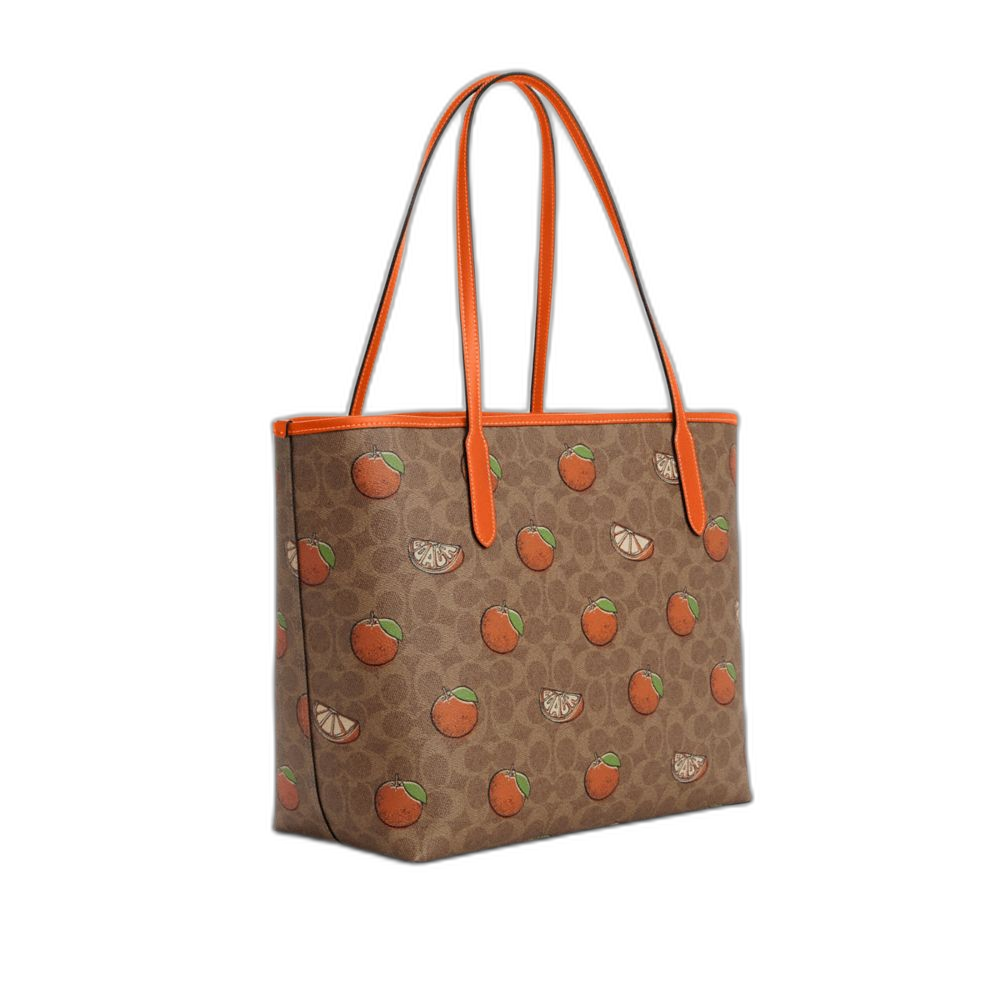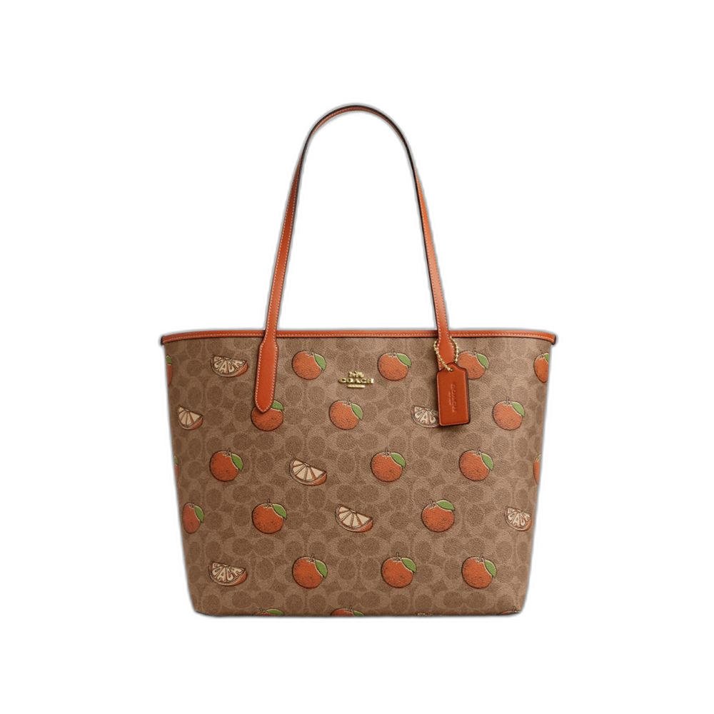 Coach Women's City Tote Bag In Signature Canvas With Orange Print Gold/Tan Multi