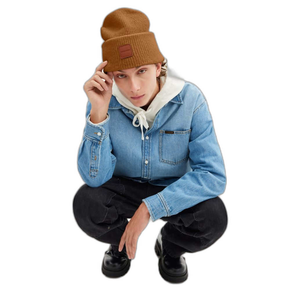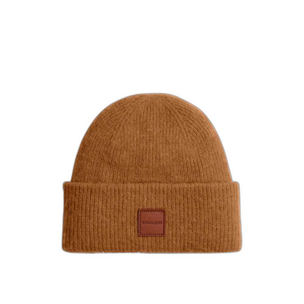 Coach Women's Knit Beanie With Leather Patch Honey Brown