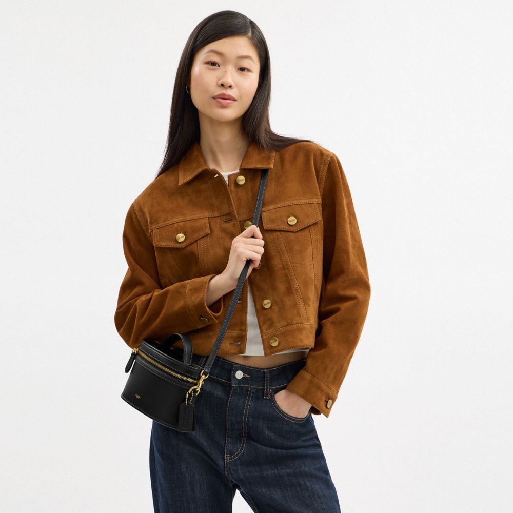 Glovetanned leather One credit card slot Zip closure, fabric lining Top handle with 1 3/4" drop Detachable short strap with... Read more